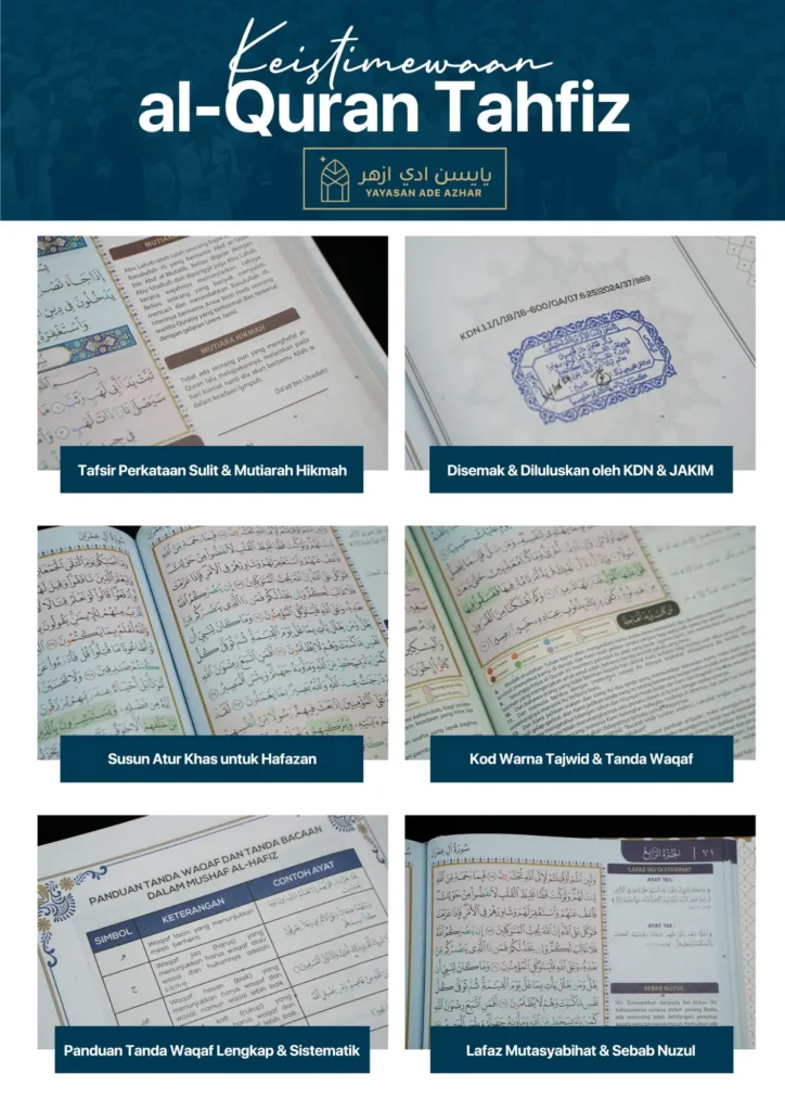 Kami terima permintaan dari pusat-pusat tahfiz dan institusi yang sangat memerlukan. Ada yang Quran mereka sudah rosak, koyak, dan ada juga yang musnah disebabkan BANJIR. Tambahan pula, Quran Premium Perkata 35 Dalam 1 ini sangat sesuai untuk para huffaz dan mereka yang ada dalam jurusan keilmuan Islam.